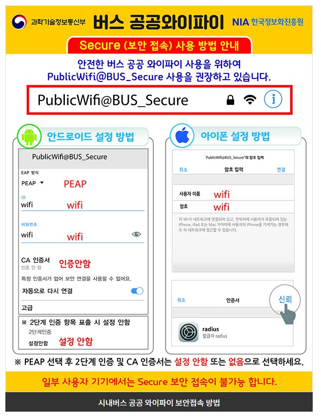 다만 시내버스 와이파이는 안정적인 데이터 이용을 위해 'Public Wifi@Bus_Secure_(노선번호)로 운영된다. 승객 위치에 따라 주변 버스의 와이파이 신호가 겹쳐 접속과 재접속이 반복되면서 데이터 끊김 현상을 보완하기 위해서다.